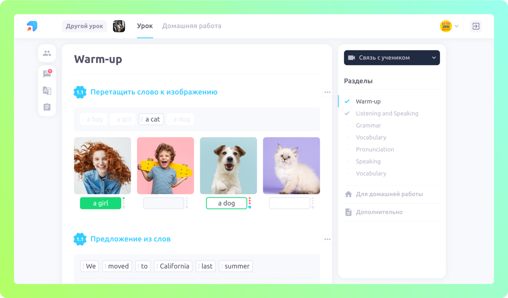 Все материалы для работы и видеосвязь в одном месте. Есть удобная автопроверка и профессиональная техподдержка. Ученики в восторге!